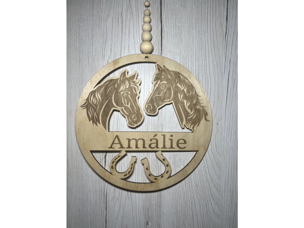 Závěsná dřevěná dekorace s gravírovanými koňmi a vyřezávanými podkovami.