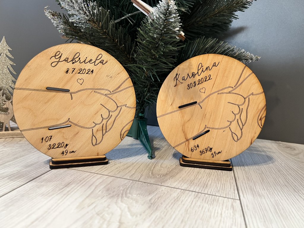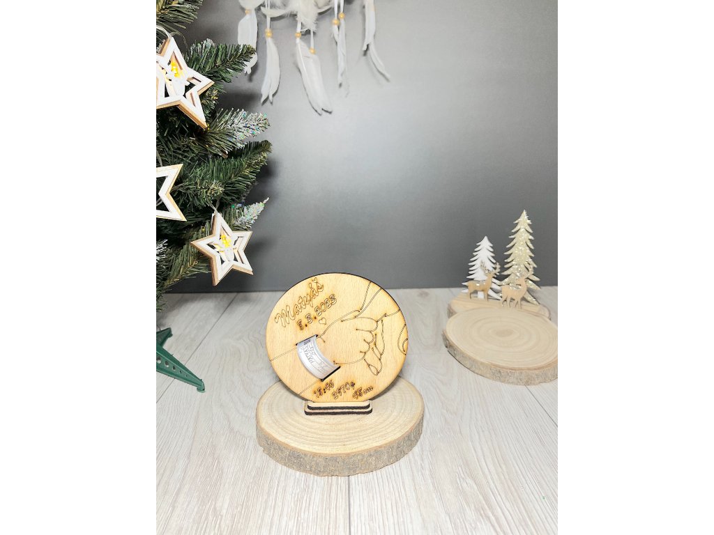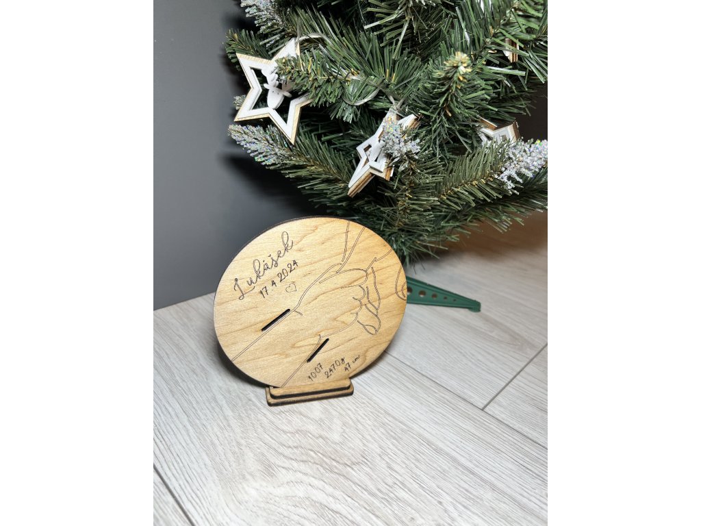 Dřevěný obrázek na stojánku s výřezem pro náramek miminka z porodnice. Vhodné jako dárek.